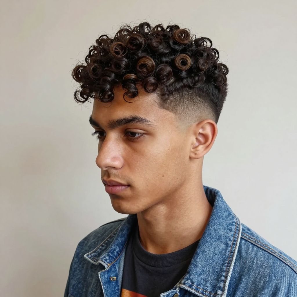 The tapered fro hawk adds just enough edge. Curls stay up top while the sides fade softly.