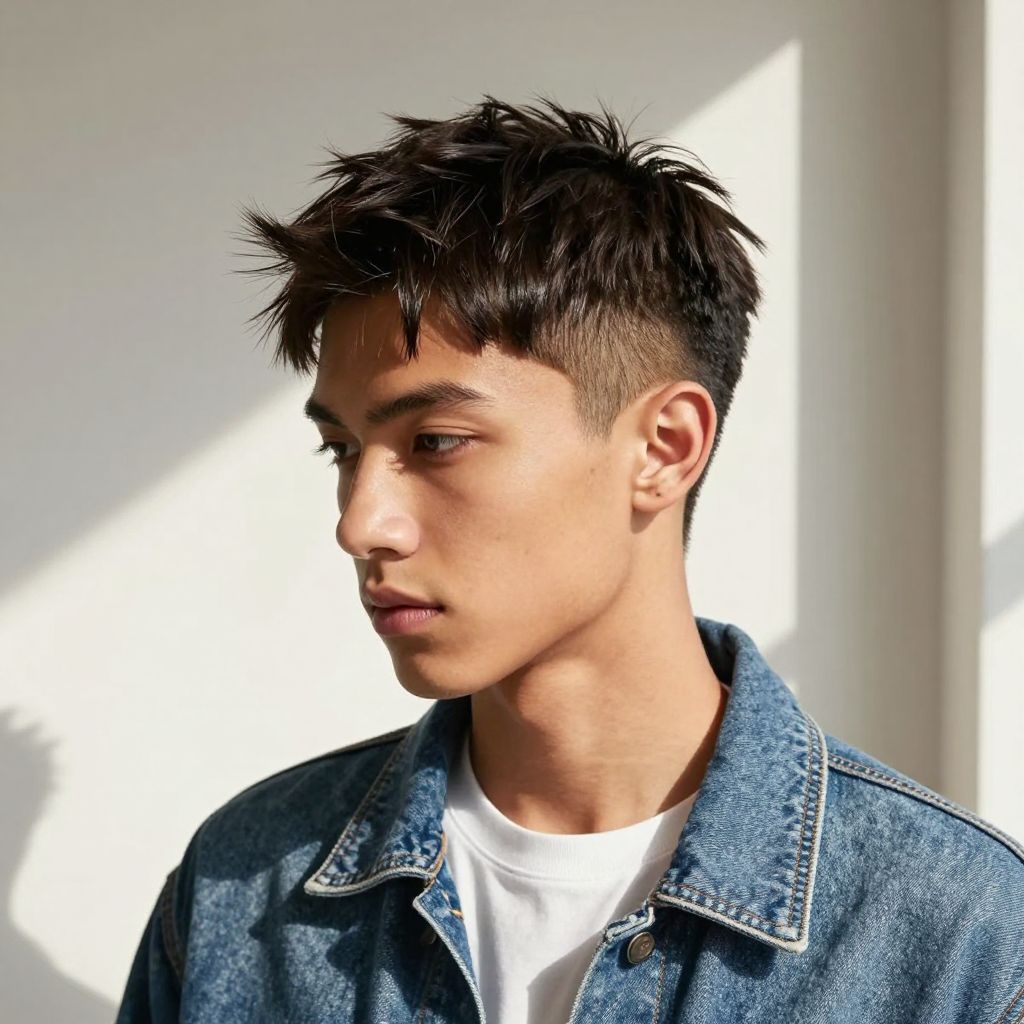 The textured fringe adds volume and a modern edge. The top is longer with natural texture and the sides stay shorter. It feels stylish yet relaxed.
