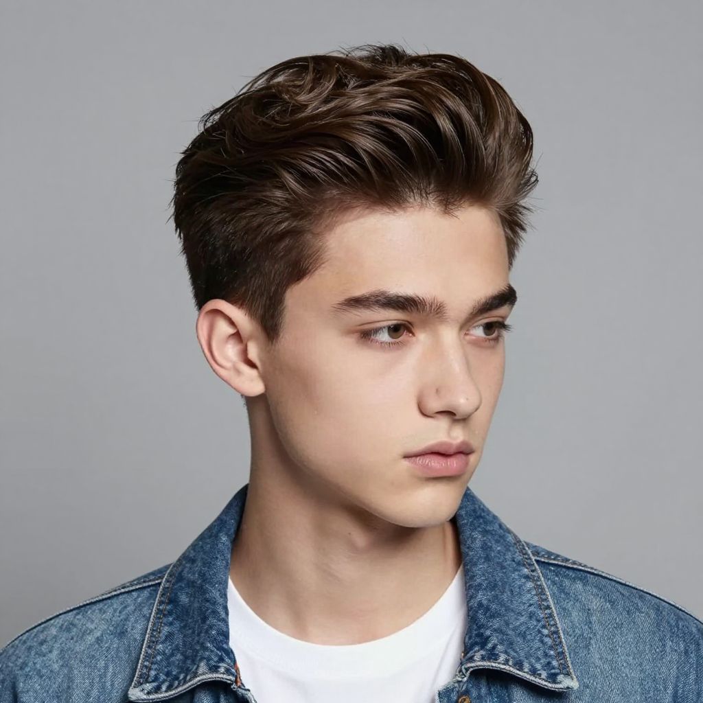 The pompadour mixes vintage style with a sleek modern twist. The front lifts with volume and the sides stay short.
