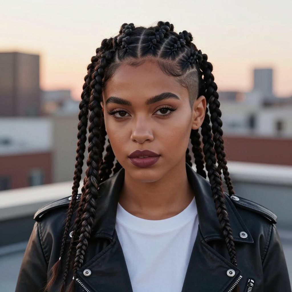 The sides stay shaved short while the top carries detailed braids. What a combo of structure and freedom.