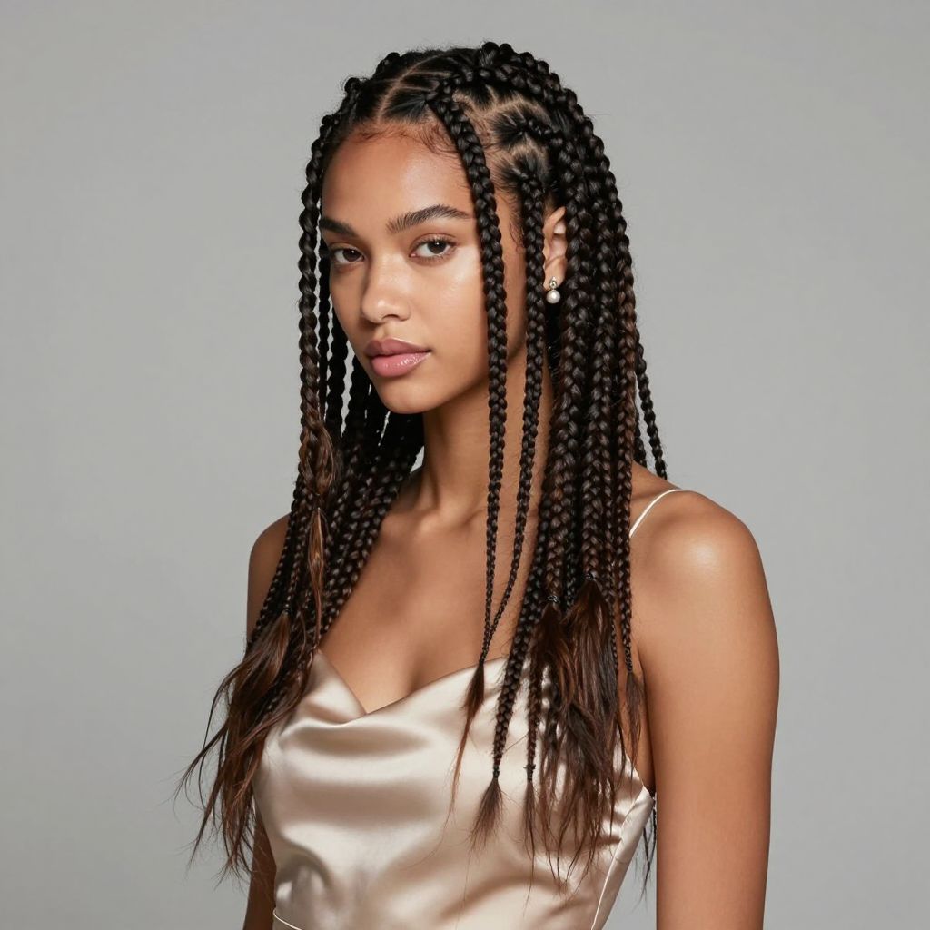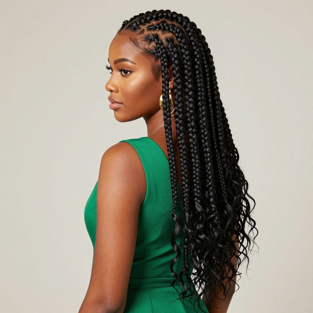 Box braids with cornrows deliver the ultimate mix of neat and thick sections. They start tight on the scalp and flow into full, stylish lengths.