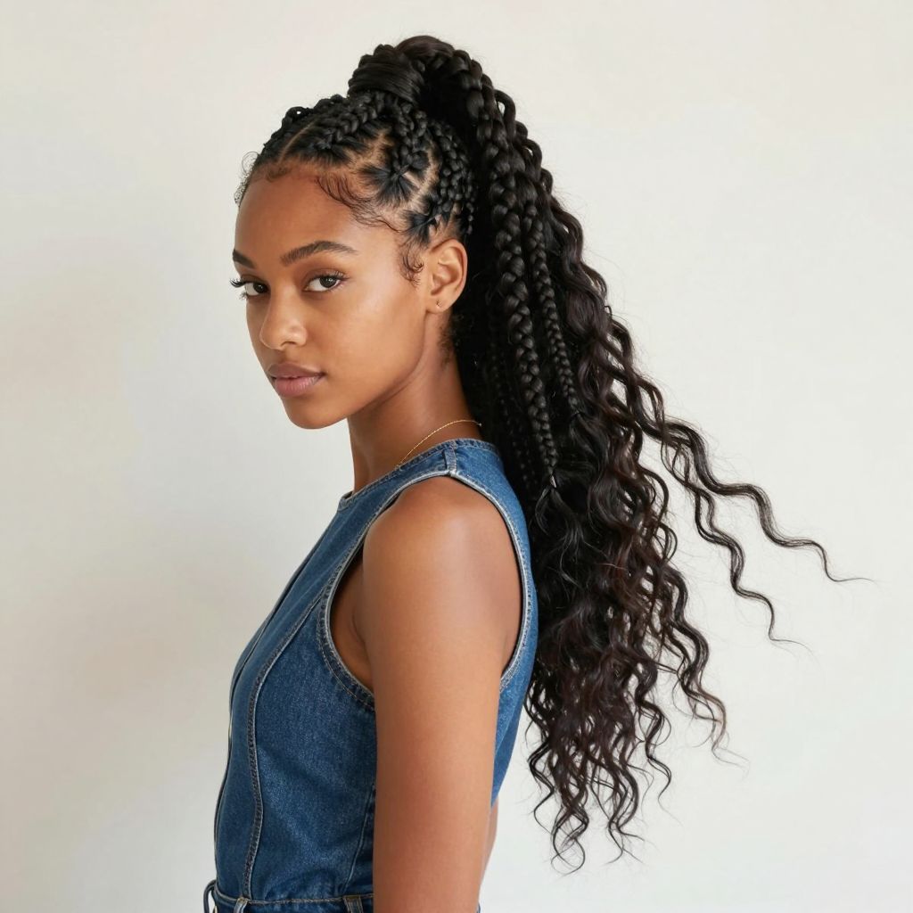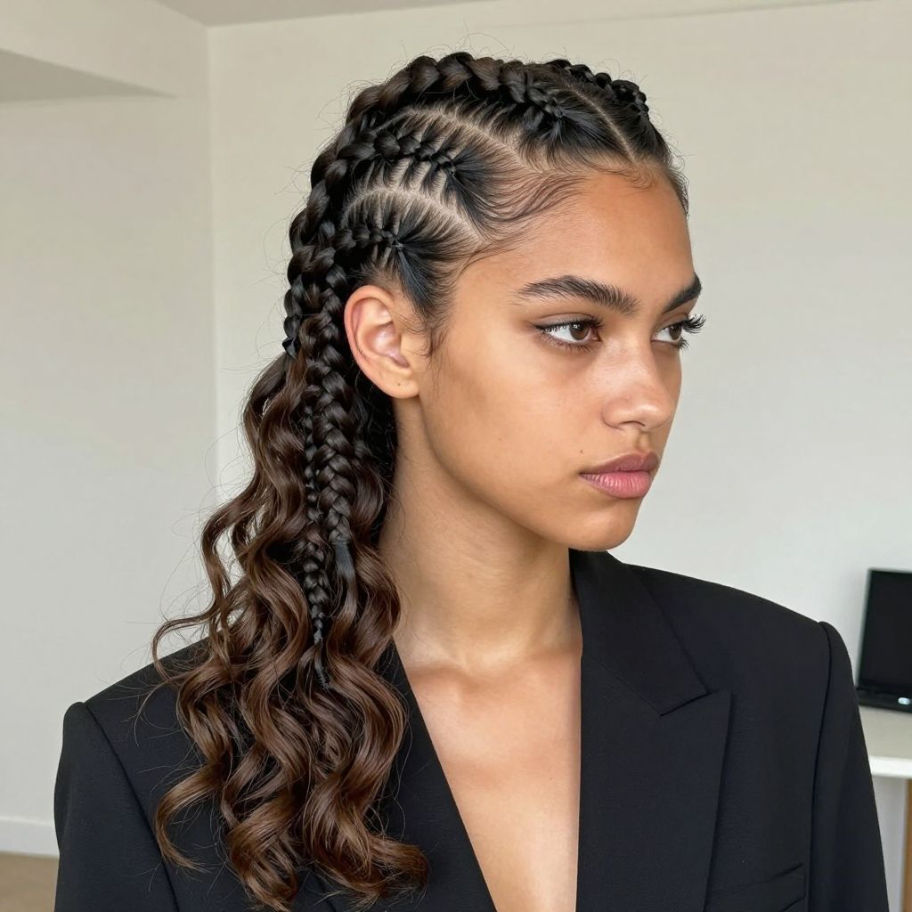 Feeling both sleek and soft? Cornrows with curls bring strong structure up top and playful romance at the ends.