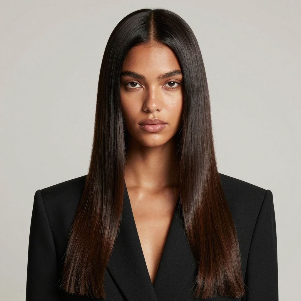 Sleek straight hair gives instant polish. Use a high-quality flat iron and finish with a shine serum for a glossy finish.