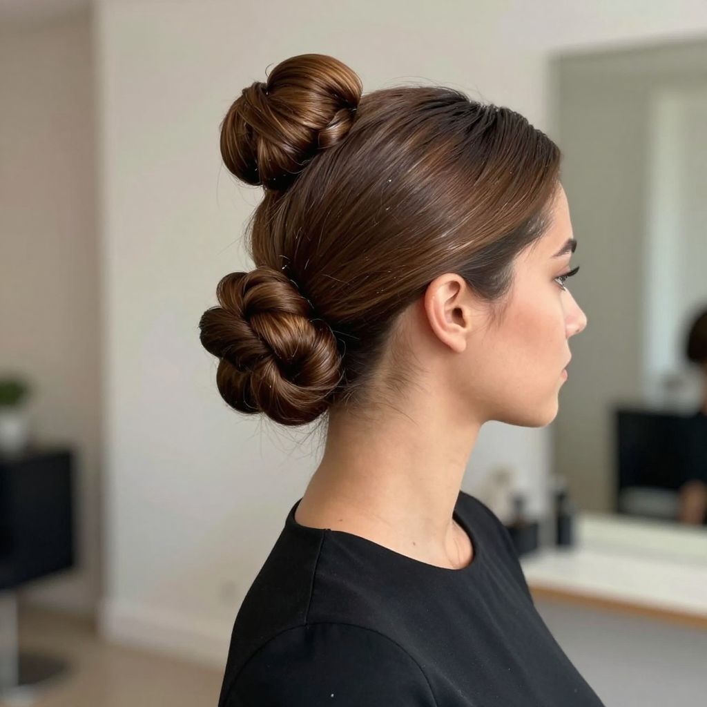 - Optional Variations: Low bun or top knot